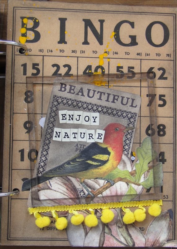 Papéis “Polka”, da coleção Scralett (Glitz Design); “Gouache” e “Estate”, da coleção “Curio” (BasicGrey); e sticky-back canvas (Ranger). Adesivos são das cartelas “Cardstock Stickers – Scarlett Journaling” (Glitz Design) e “Element Stickers – Curio” (BasicGrey). Transparência “The Birdcages” (Hambly) e “2011” de feltro (Arte.1). “Sujei” a capa com Rub-On metálico. Página de acrílico Arte.1.